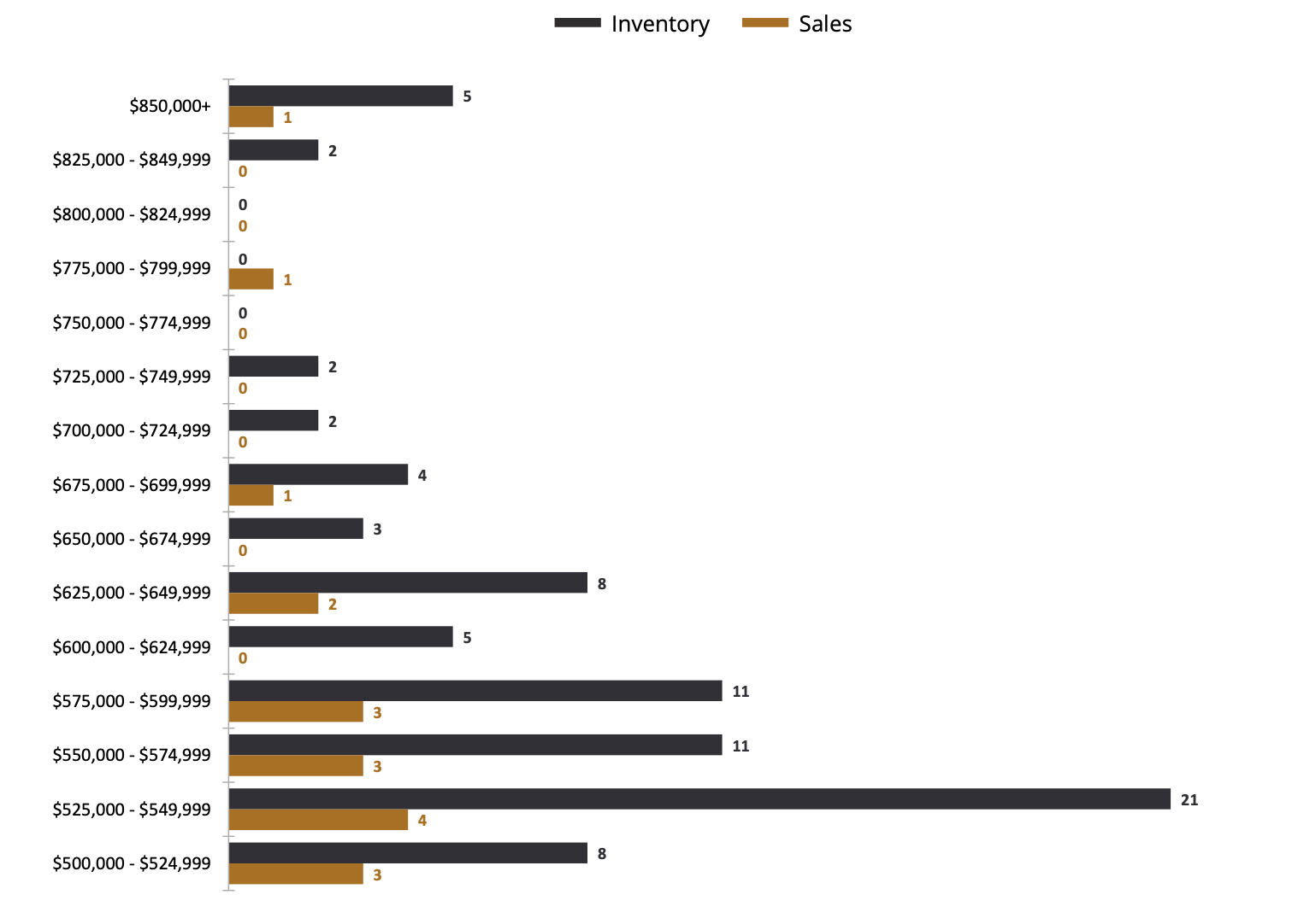 We compare Inventory to Number of Homes Sold to determine if it is a Buyer’s or Seller’s Market. In the $900k price range, there are 83 homes available and 31 sold, less than 3 months of inventory = Seller’s Market.